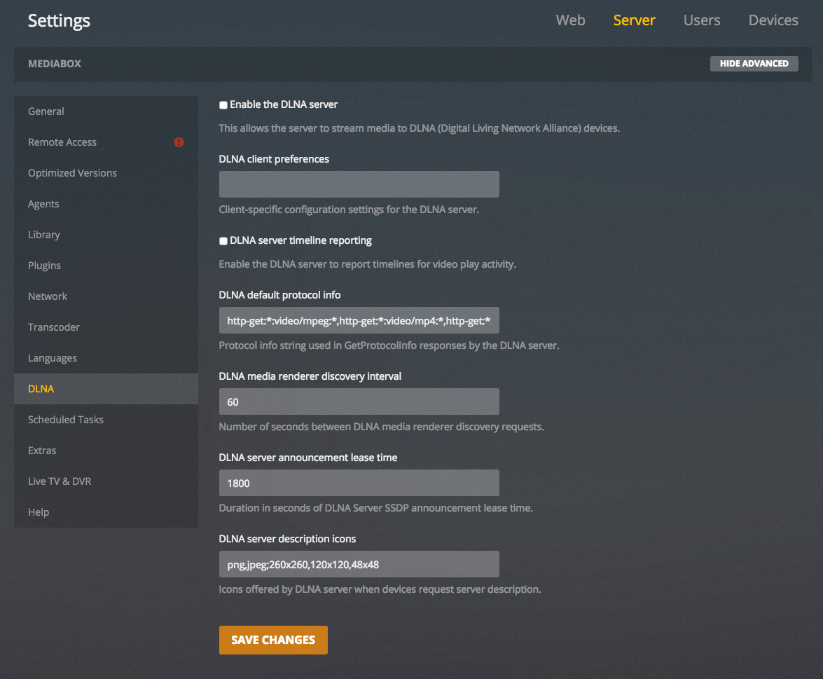 Click the Settings icon (top right) → "Server" (top) → "DLNA" (left).