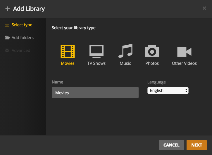 In the "Add Library" window, select "Movies" and click "NEXT".